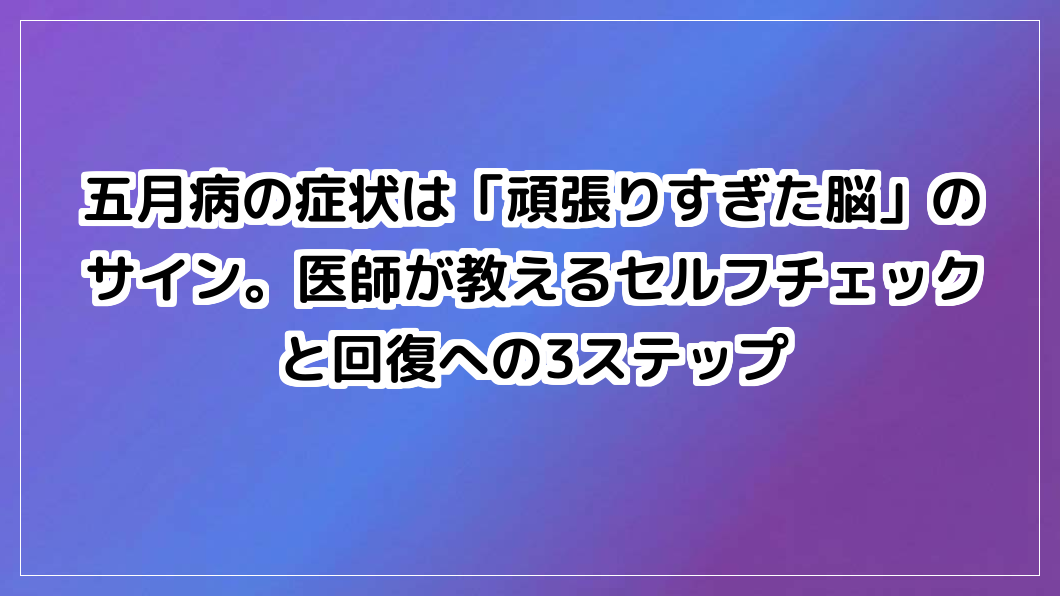 5月病の症状は頑張りすぎた脳のサイン。やる気が出ない、体がだるいといった不調の原因を医師が解説します。セルフチェック項目や、睡眠を中心とした回復への3ステップを紹介。まずは今の状態を知り、脳を休めましょう。