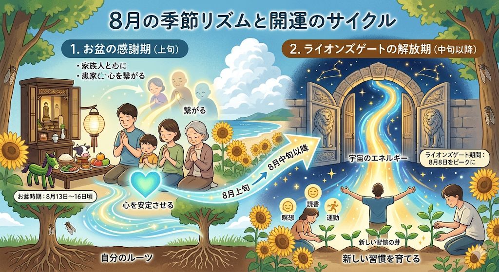 「今日は良い日だから、無理せず休もう」「今日は新しいことを始めるのに適した日だから、小さな一歩を踏み出そう」。このように吉日をトリガーにすることで、脳はポジティブな行動を選択しやすくなります。8月は、外的な幸運を待つのではなく、先祖への感謝や自然のエネルギーを取り入れ、自分自身の心身を整えることで、運気の流れを自ら作り出すのに最適な季節なのです。