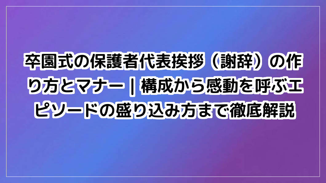 卒園式の保護者代表挨拶(謝辞)は不安ですよね。この記事では、感謝を伝える心温まる謝辞の作り方、マナー、構成、感動エピソードの盛り込み方まで徹底解説。卒園式 保護者代表挨拶 例文も参考に、自信を持って臨みましょう。