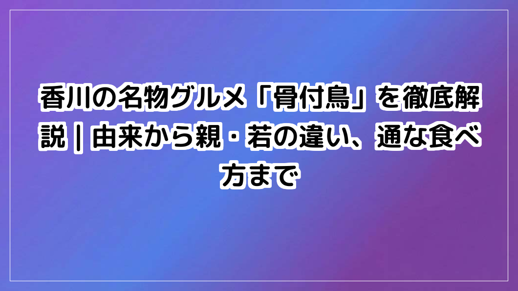 香川県丸亀市発祥の名物グルメ「香川骨付鳥」を徹底解説。初心者におすすめの「わか」と通好みの「おや」の違い、おにぎりを油に浸す地元流の食べ方、人気店選びのコツまで、本場の味を120%楽しむための情報を網羅しました。