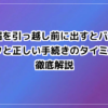 | 旧居(退去時) | 引っ越しの1週間前〜前日まで | 荷造りで騒がしくなる前に済ませる |