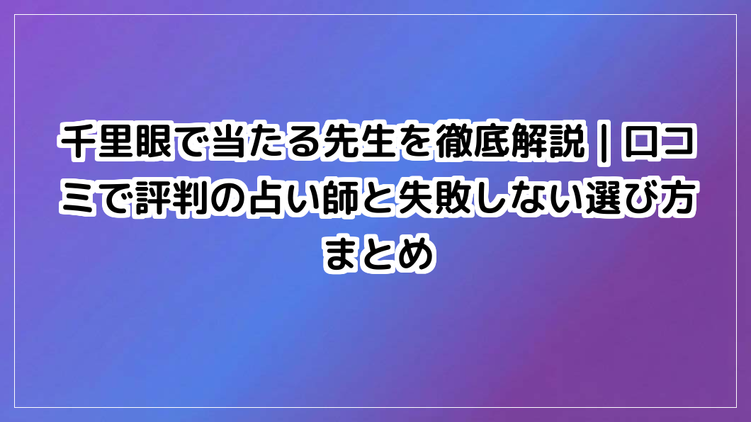 千里眼で本当に当たる先生を探していませんか?口コミで評判の占い師を徹底解説し、失敗しない選び方をまとめました。あなたの悩みを解決し、未来を好転させる占い師がきっと見つかります。