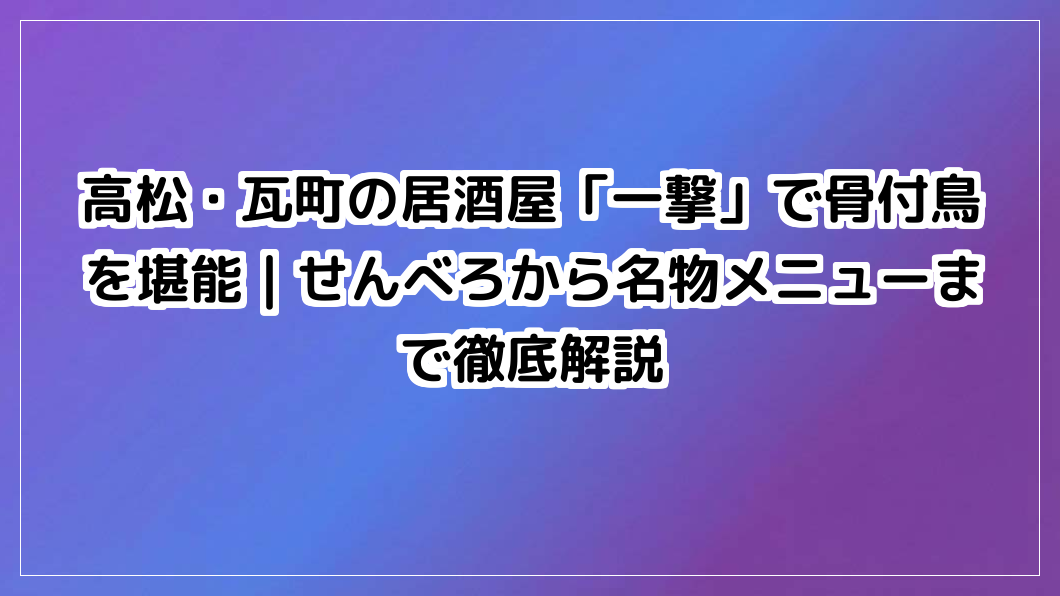 高松・瓦町で人気の居酒屋「一撃」を徹底解説。名物の骨付鳥(若・親)の魅力や、18時までの超お得な「せんべろセット」、店内の雰囲気まで紹介します。骨付鳥 一撃で、香川の夜をコスパ良く満喫したいあなたは必見です。